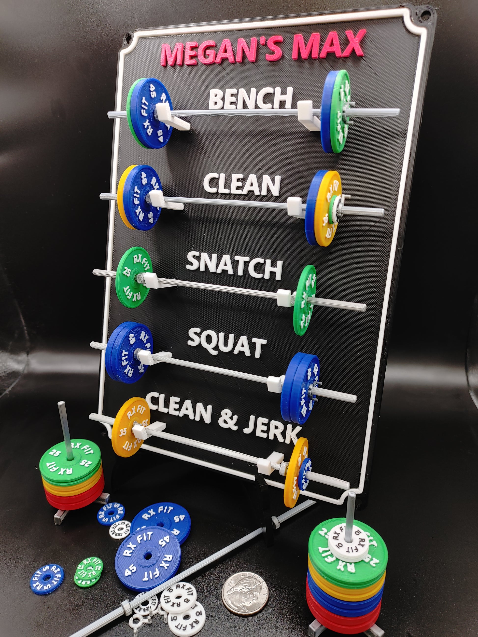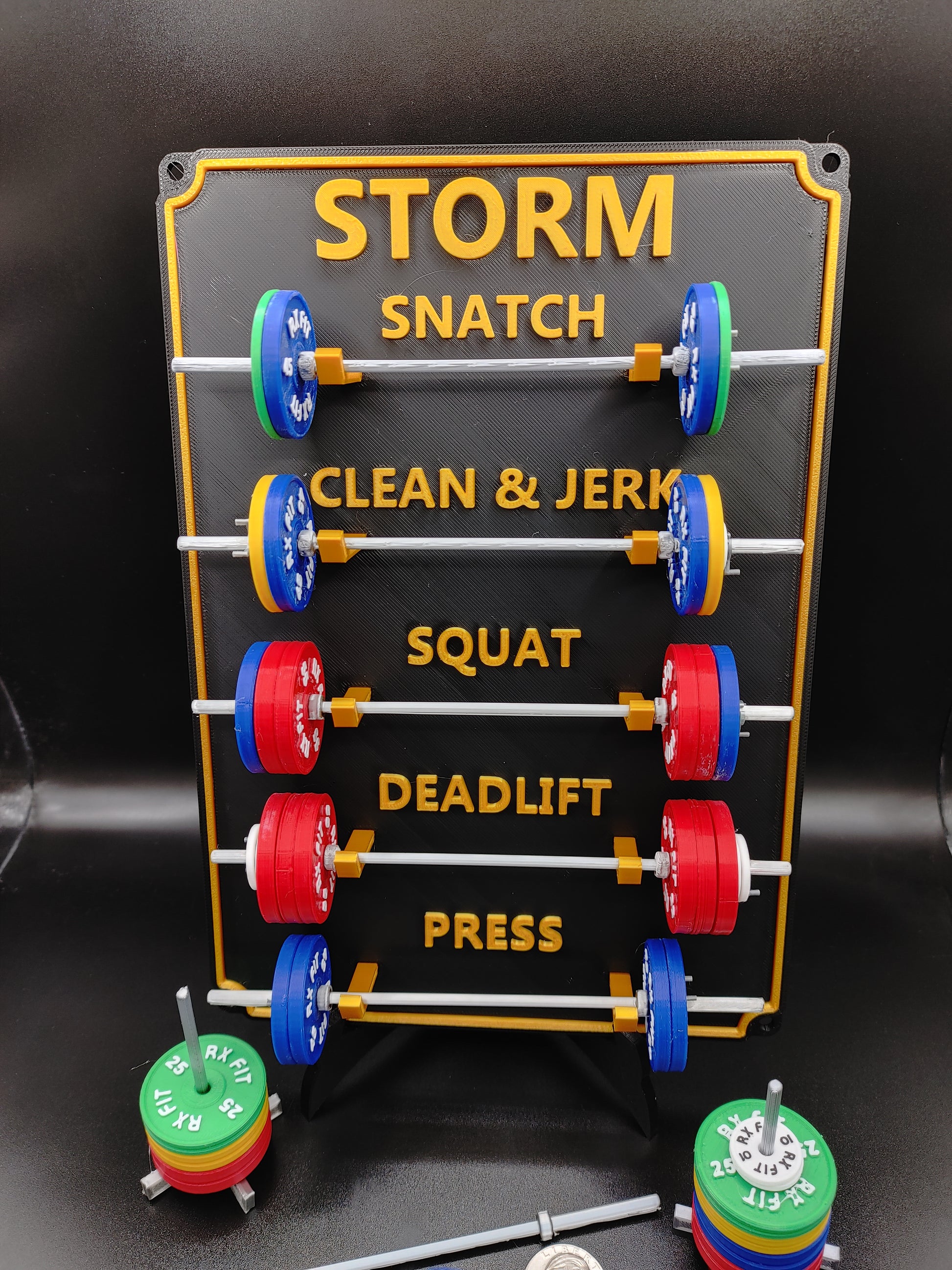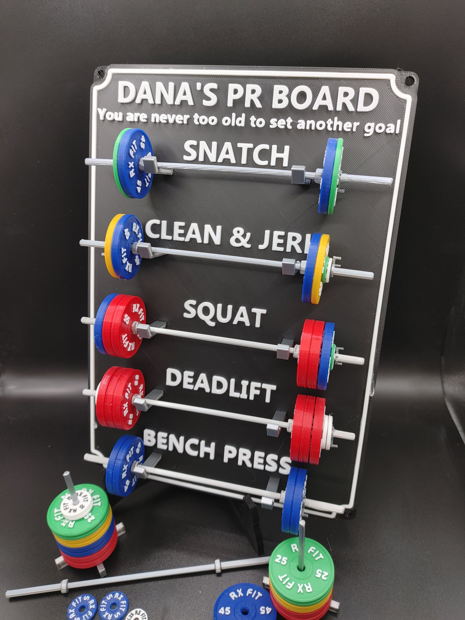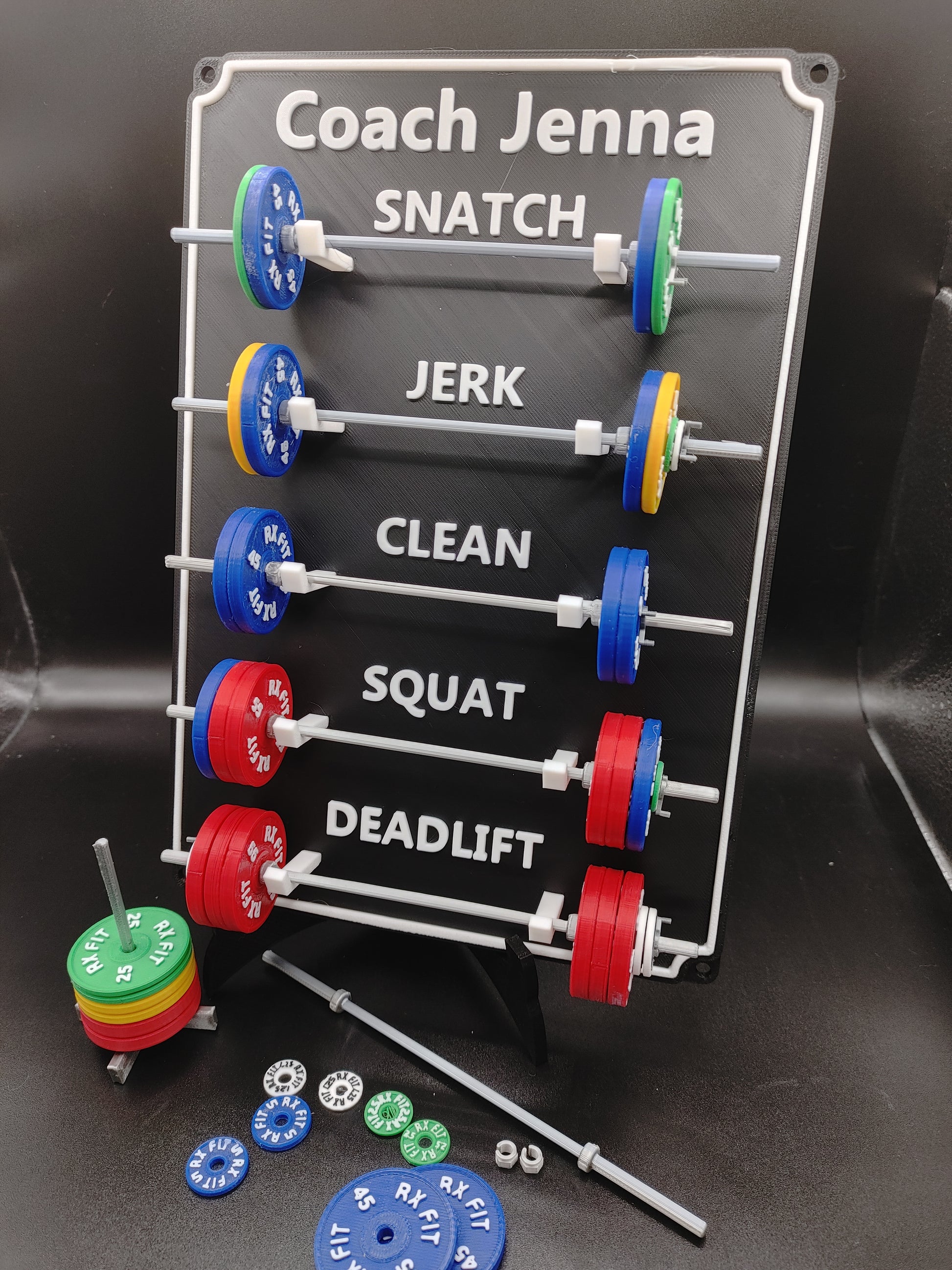Weightlifting personal tracking board, 5 lifts, show off your work with miniature barbells for your home gym