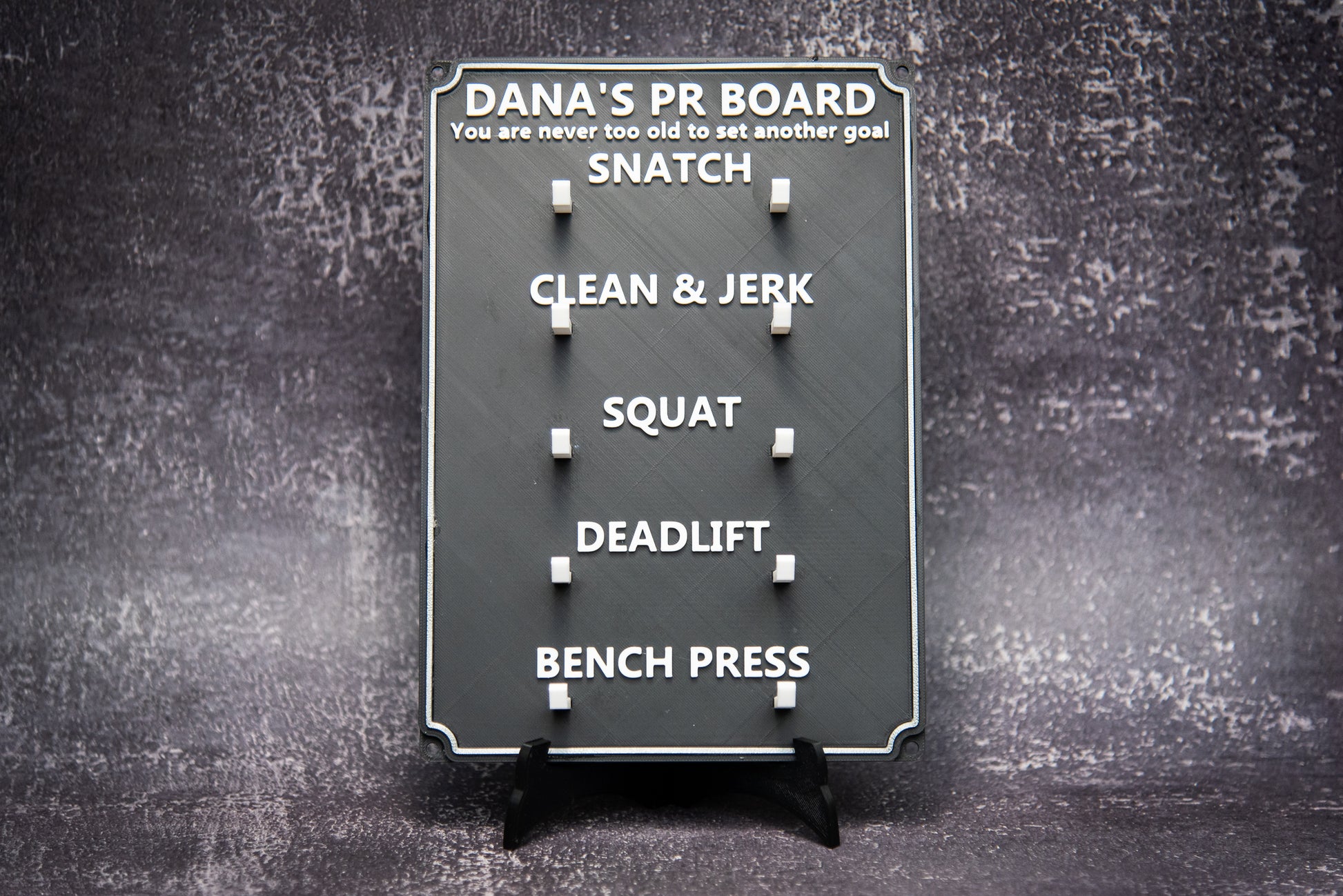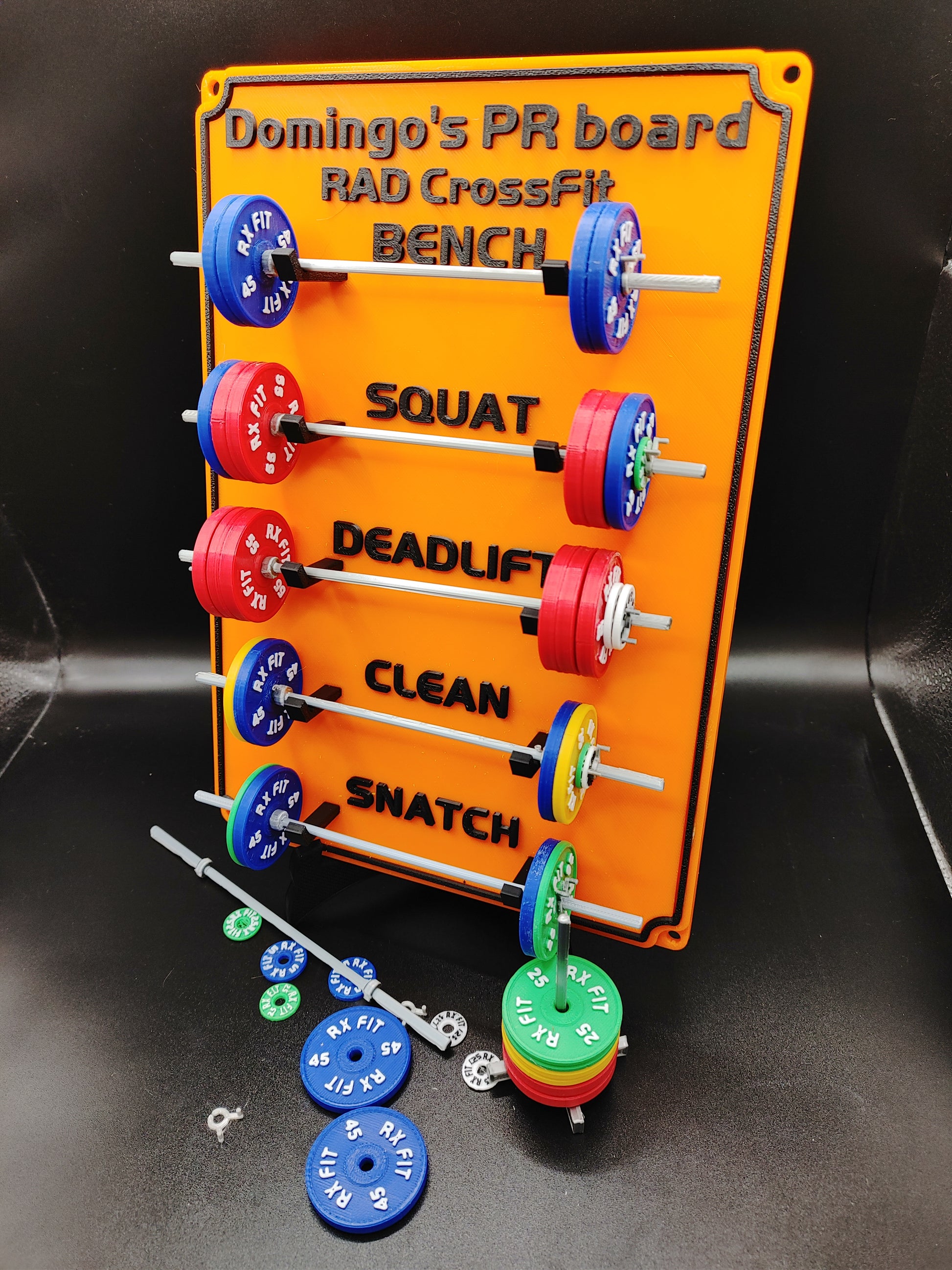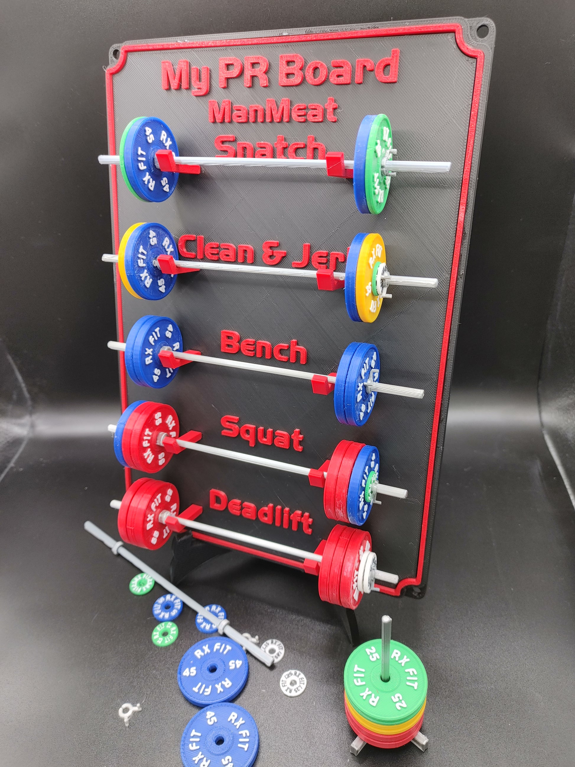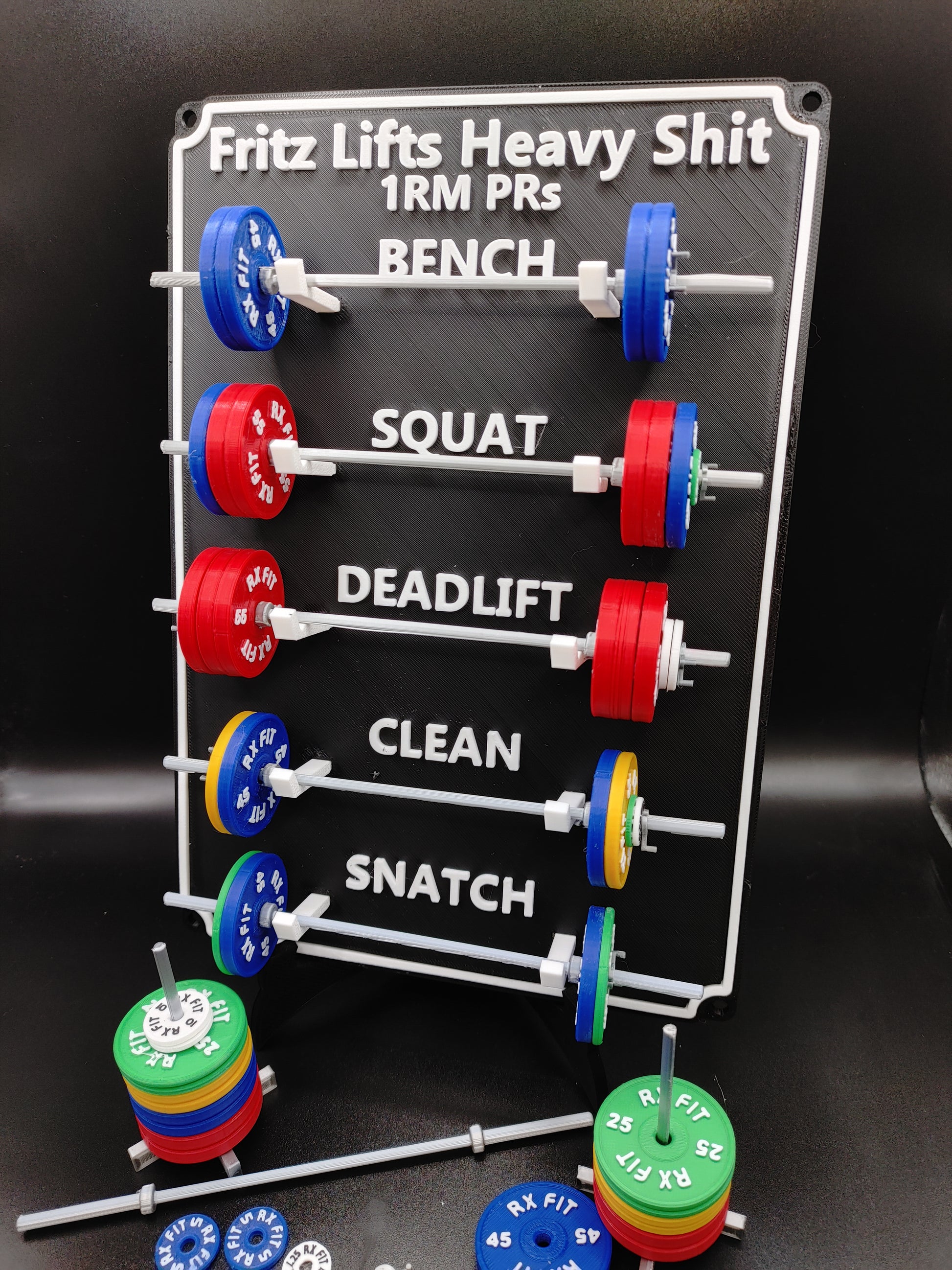 Weightlifting personal tracking board, 5 lifts, show off your work with miniature barbells for your home gym