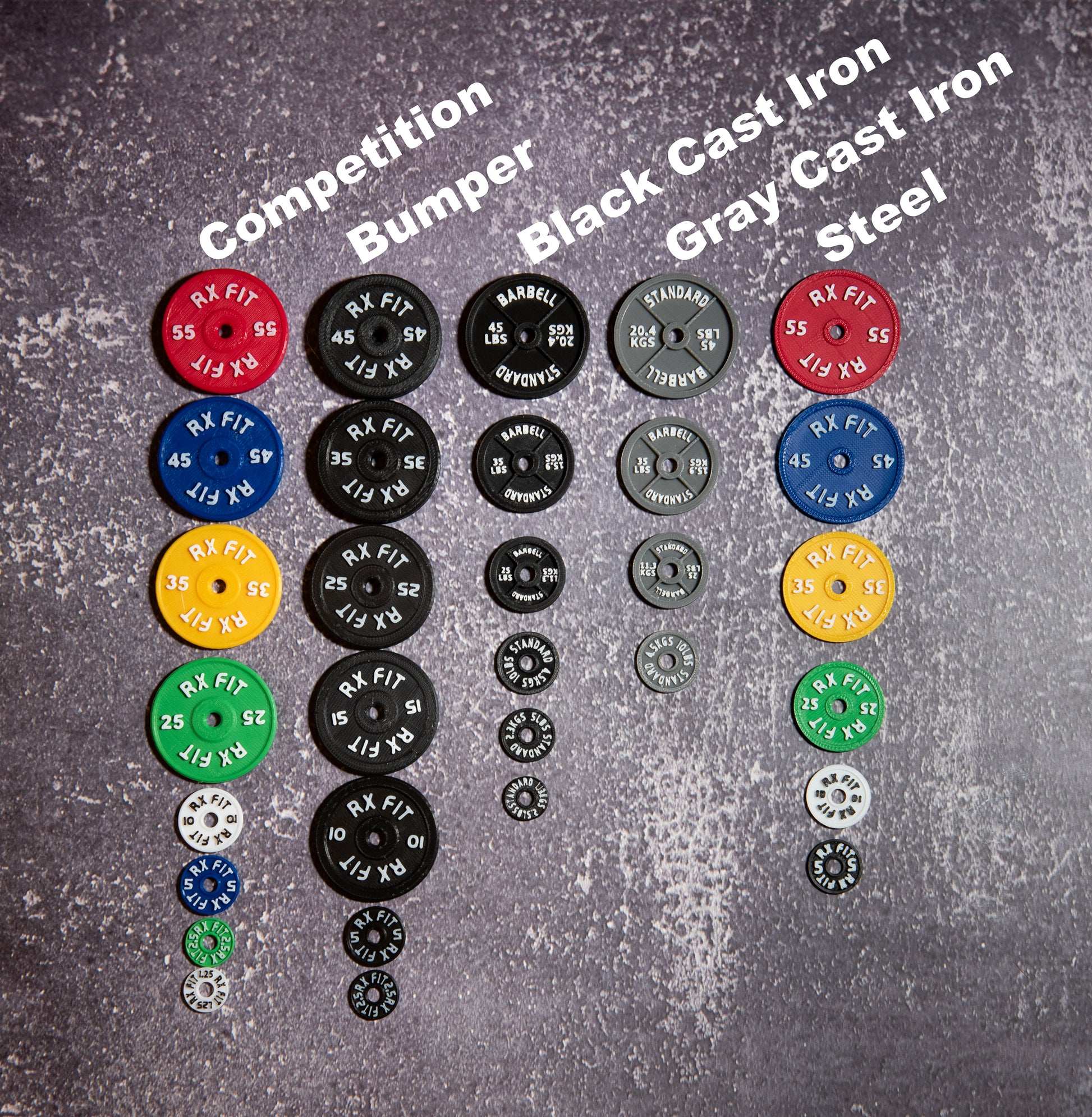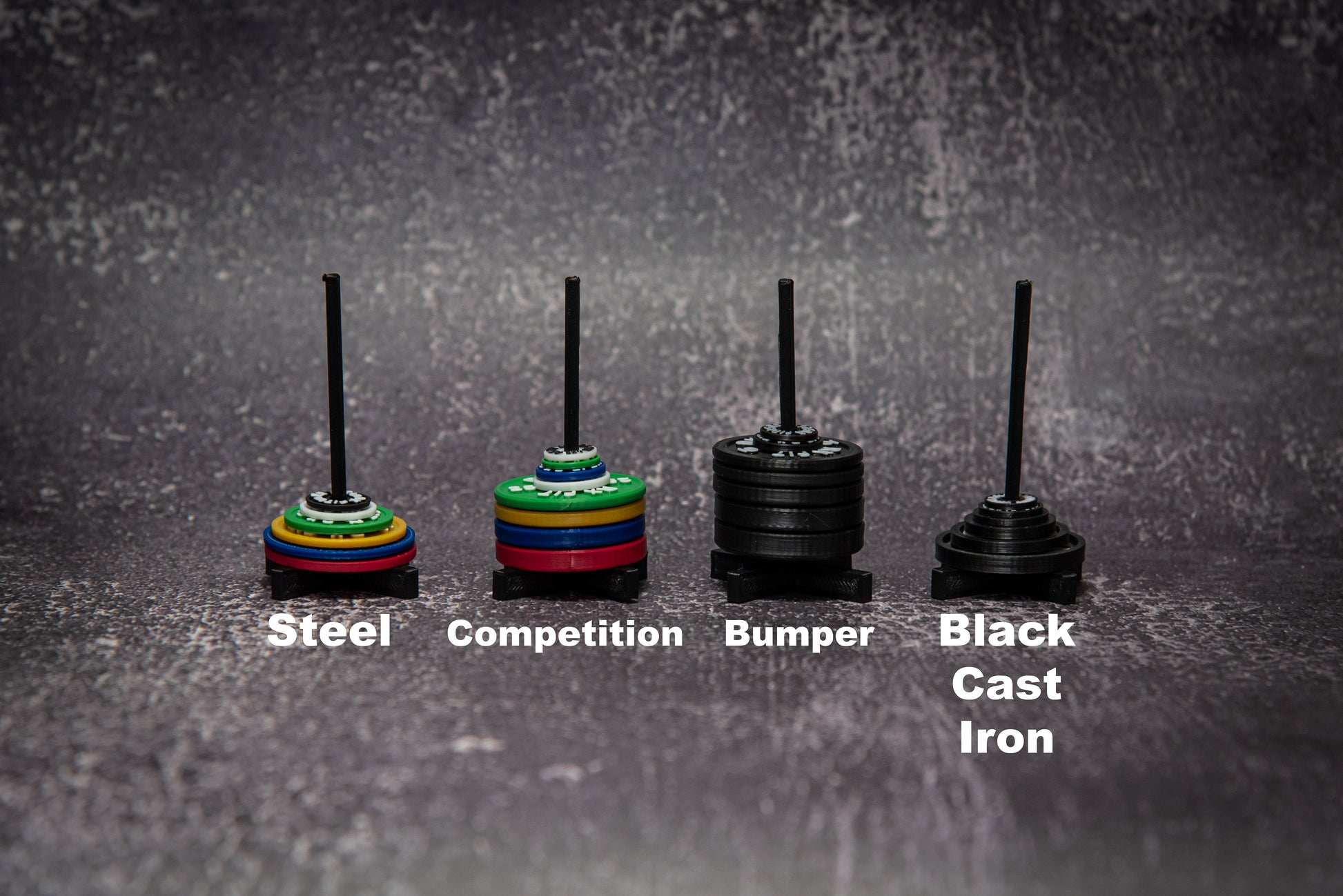 Each plate is meticulously designed and measured to represent actual real life plates. The black bumper plates are nice and thick while the competition plates are thinner and more colorful. Every plate can be customized to your liking and can have custom lettering!