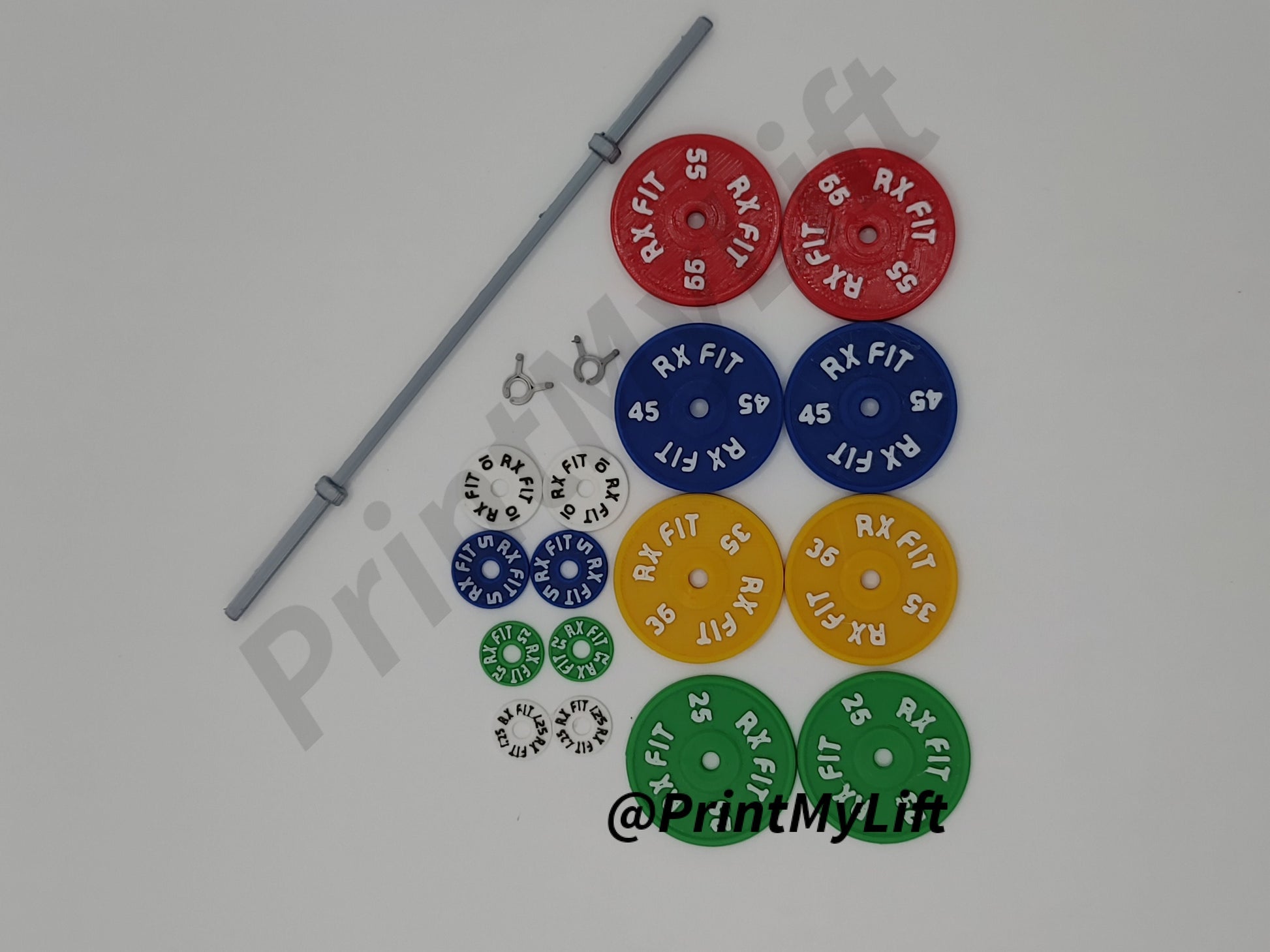 Includes a barbell (that represents a 45lb barbell), 2 functioning clips and the following plates: